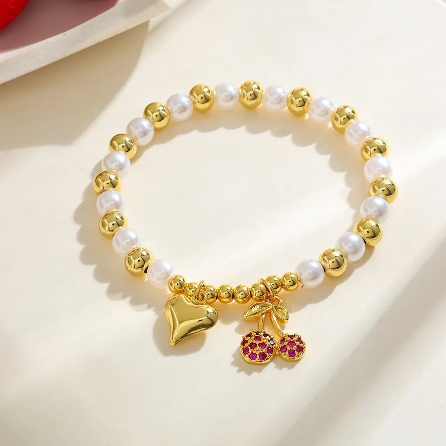 🍒💖 Cherry & Heart Cross Bracelet - Copper Plated Zircon Pendant Elastic